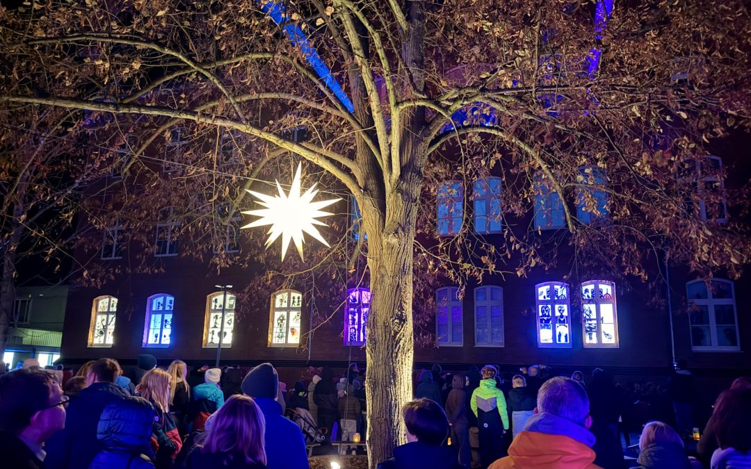 Zwischen frischen Keksen und weihnachtlichen Grußkarten gaben die 6e, 5e und die Chor-AG zu der Klavierbegleitung von Frau Wrachtrup-Klaß um 17 Uhr den Auftakt zum diesjährigen Lichterfest mit dem Lied „Zünd ein Licht an“. Danach dankte Frau Werner, unsere Schulleiterin, mit herzlichen Worten allen organisierenden Lehrkräften sowie der Technik-AG und widmete ihnen das Lied „Golden“, welches danach vom kleinen Chor gesungen wurde.